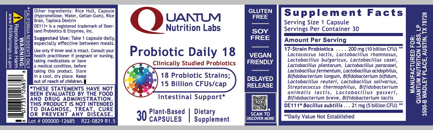 Amazon Com Quantum Nutrition Labs Probiotic Daily 18 Vegan With 15 Billion Cfus Per Cap Supports Favorable Gut Bacteria 30 Plant Based Capsules Health Household